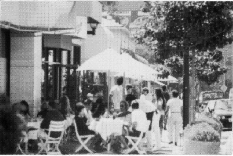 Outdoor cafes located in pedestrian-oriented district Inclusion of pedestrian-oriented amenities in regional center (Century City): buildings located on sidewalks, buildings open to exterior, trees and landscape, benches, pedestrian-scaled lighting fixtures.